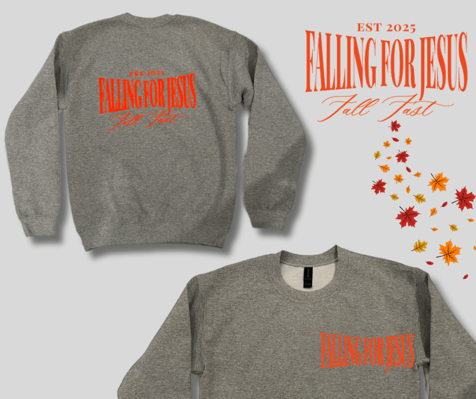 Featuring the bold Falling for Jesus graphic on the front and the full EST 2025 Fall Fast design across the back, this sweatshirt is both a statement of faith and a fall fashion staple.